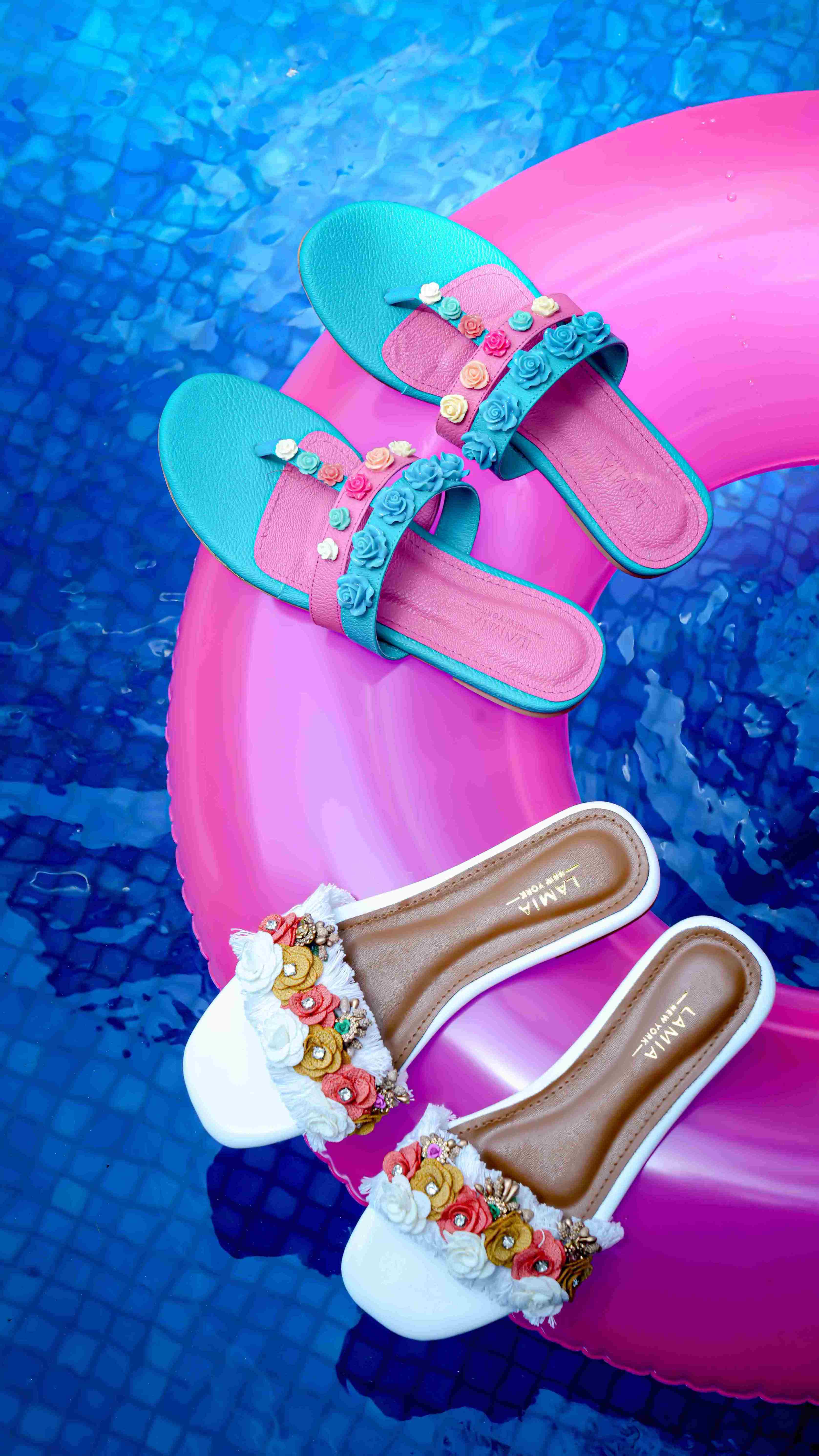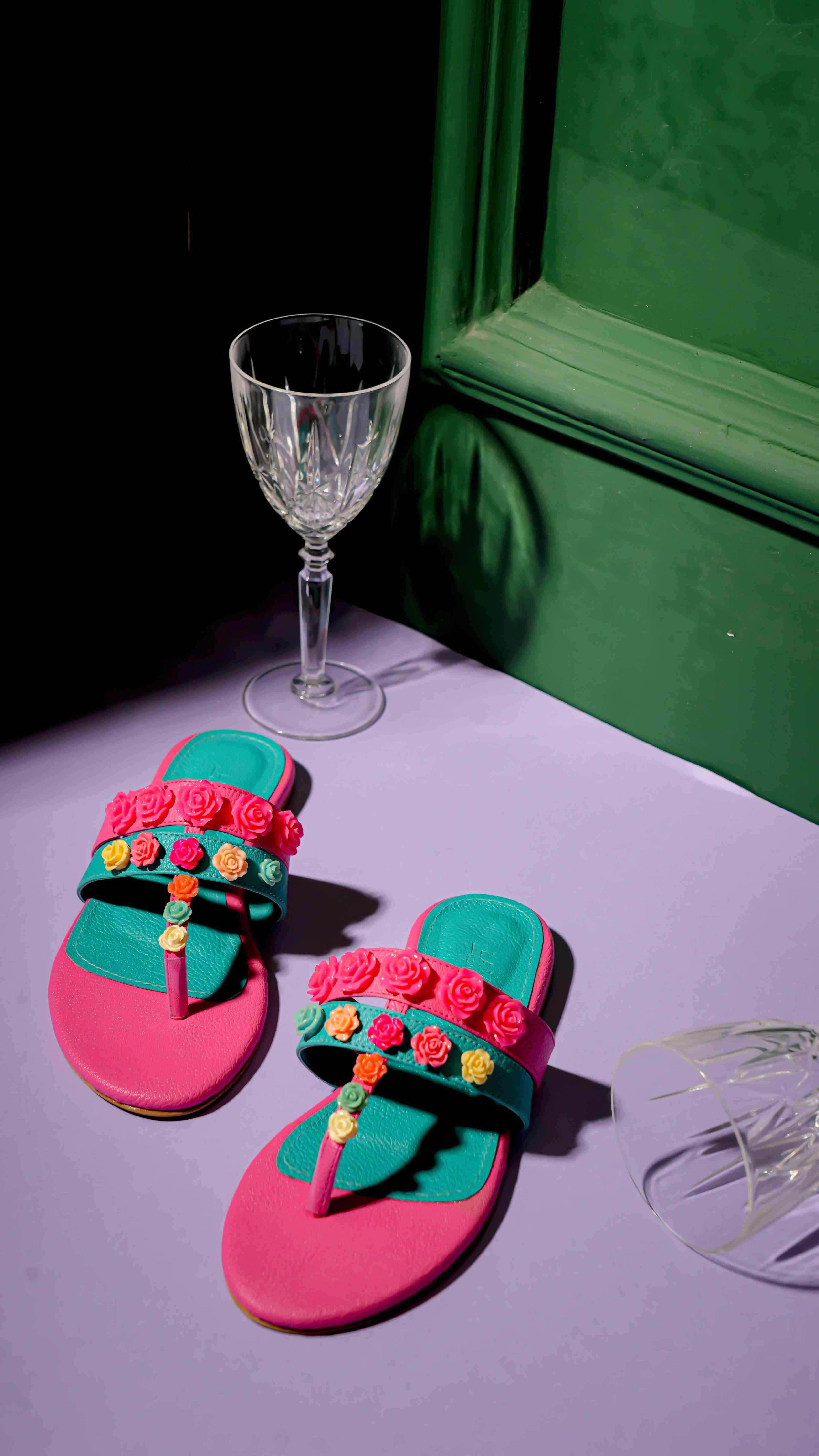 Crafted in soft leather with a teal footbed and hot-pink base, these playful flats are hand-embellished with colorful floral appliqués. A sweet pop of color for days when subtle just isn’t you.